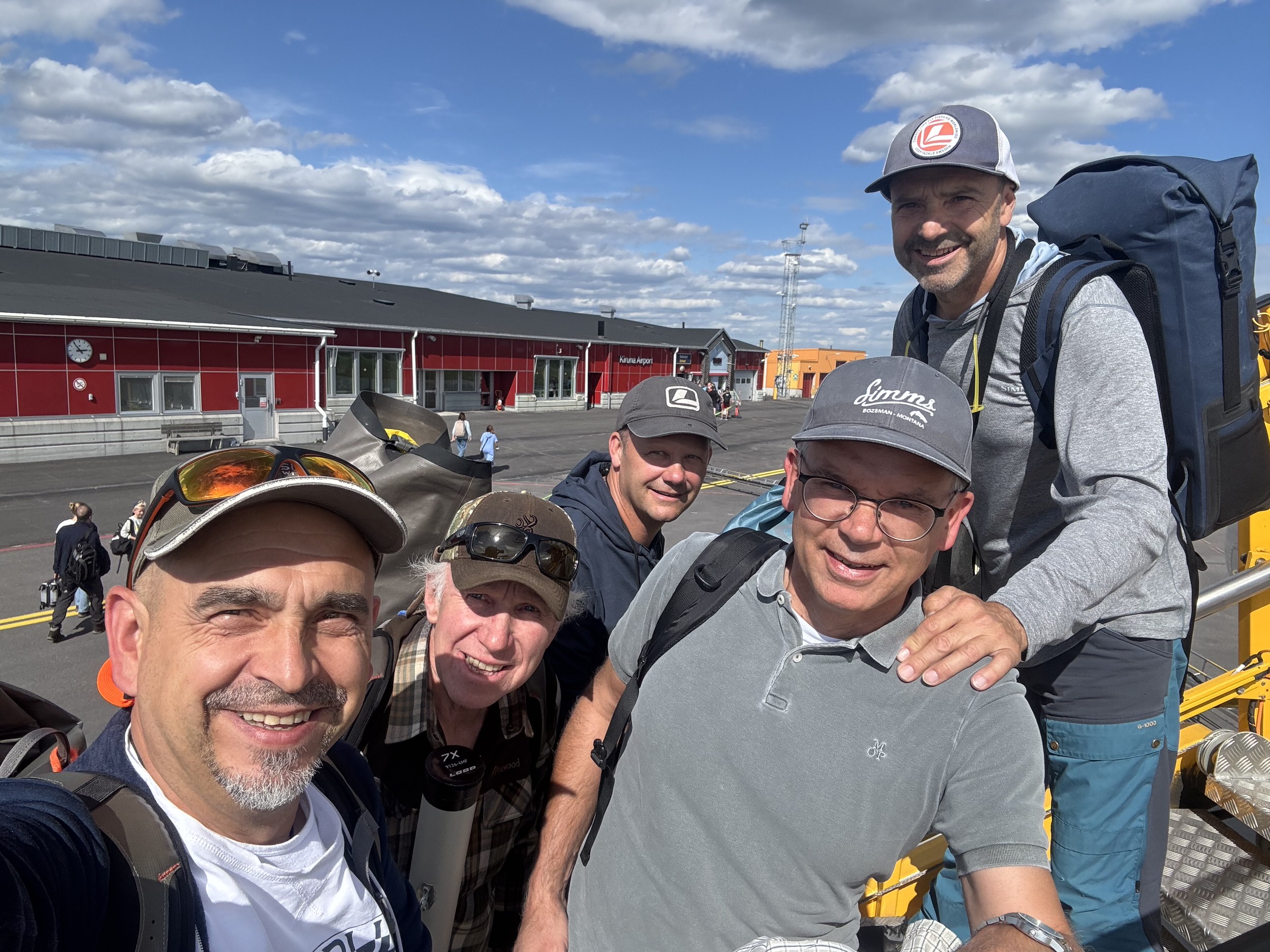 Voller Erwartung auf eine spannende Fliegenfischerwoche, mit hoffentlich guten Bedingungen, ging es in Richtung Flughafen. Alle Gepäckstücke lagen im Gewichtslimit und die Anreise verlief bestens, sodass wir pünktlich in Kiruna bei herrlichem Sonnenschein ankamen. Fabio stand mit dem VW-Bus am Flughafenausgang bereit, um uns abzuholen. Auf dem Weg zur Lodge holten wir noch den vorbestellten Proviant und genügend Bier im Supermarkt ab.