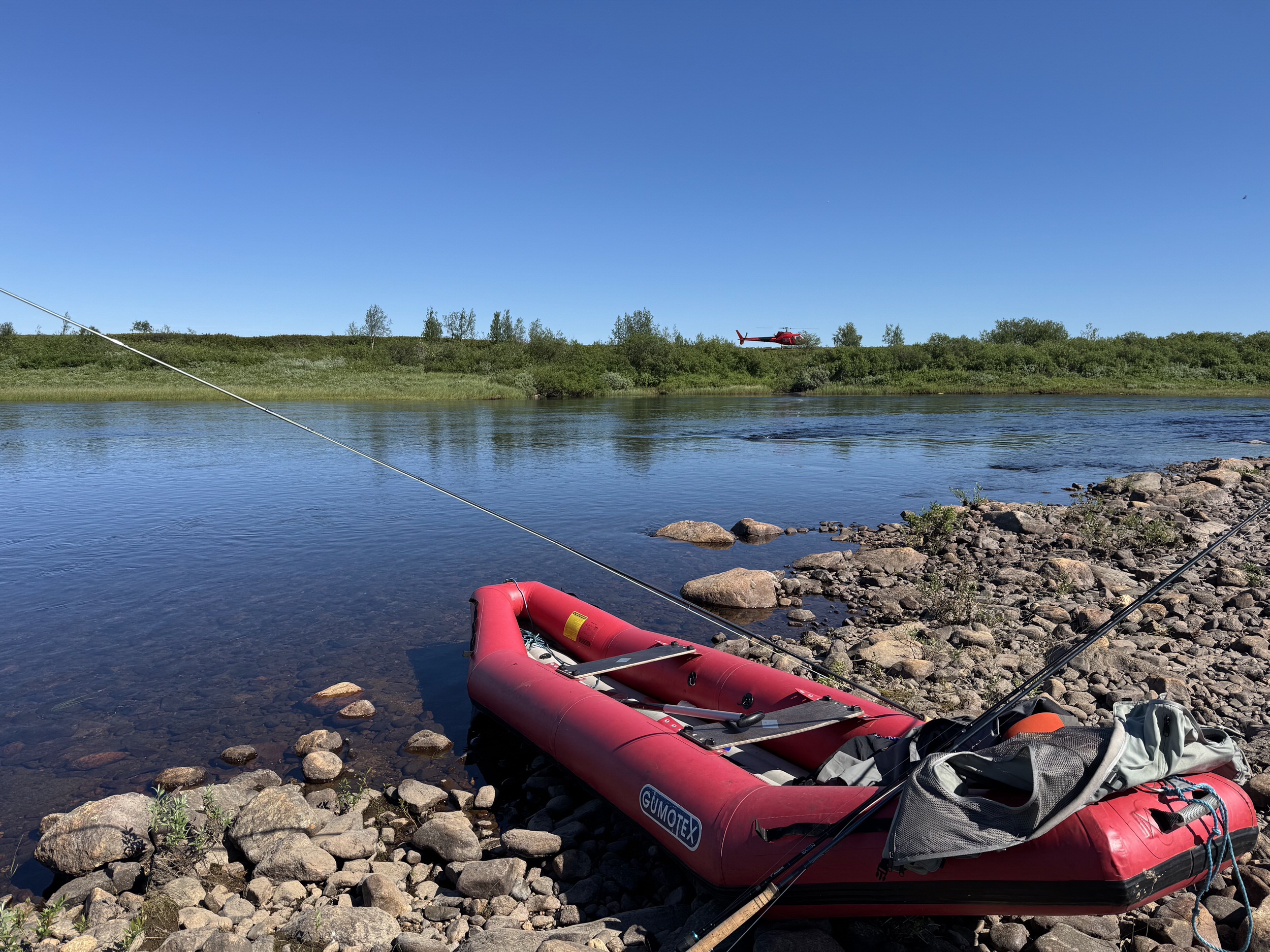 Nach überstandenem Wiegeprozess wurde der Heli beladen und los gings. Für dieses Jahr waren wir die erste Gruppe, die an den Fluss ausgeflogen wurde. Während des Fluges zeigten sich bereits die schneebedeckten schwedischen Berge am Horizont und unter uns eine nahezu, unberührte Tundra.