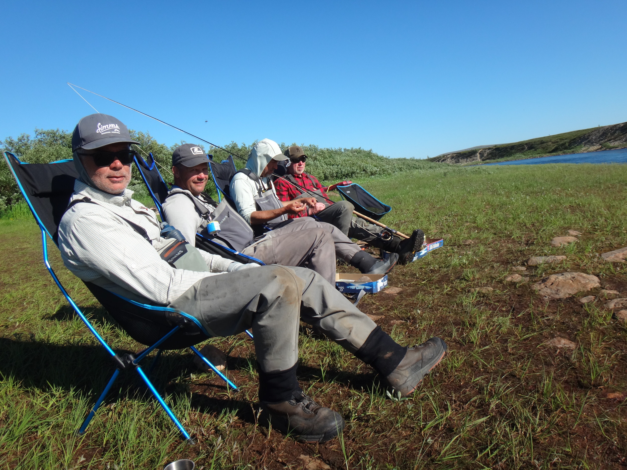 Während der Woche trafen wir lediglich zwei Angler an, ansonsten hatten wir den ganzen Fluss für uns alleine. Allerdings wurden wir zweimal per Heli im Niemandsland kontrolliert. Einmal sogar gleich von drei Kontrolleuren in FBI- Manier, die sämtliche Papiere von uns einsehen wollten und unser Lager inspizierten, ob nicht ein zu viel gefangener Lachs im Gebüsch versteckt wurde. Ein kleiner Unfall passierte Gerald, dem der Wind den Angelhaken in den Arm rammte. Souverän und fachmännisch wurde dieser dann in Teamwork wieder entfernt. Gerald erwies sich dabei als tapferer Patient, der beim Durchstechen des Hakens nicht einmal zuckte.